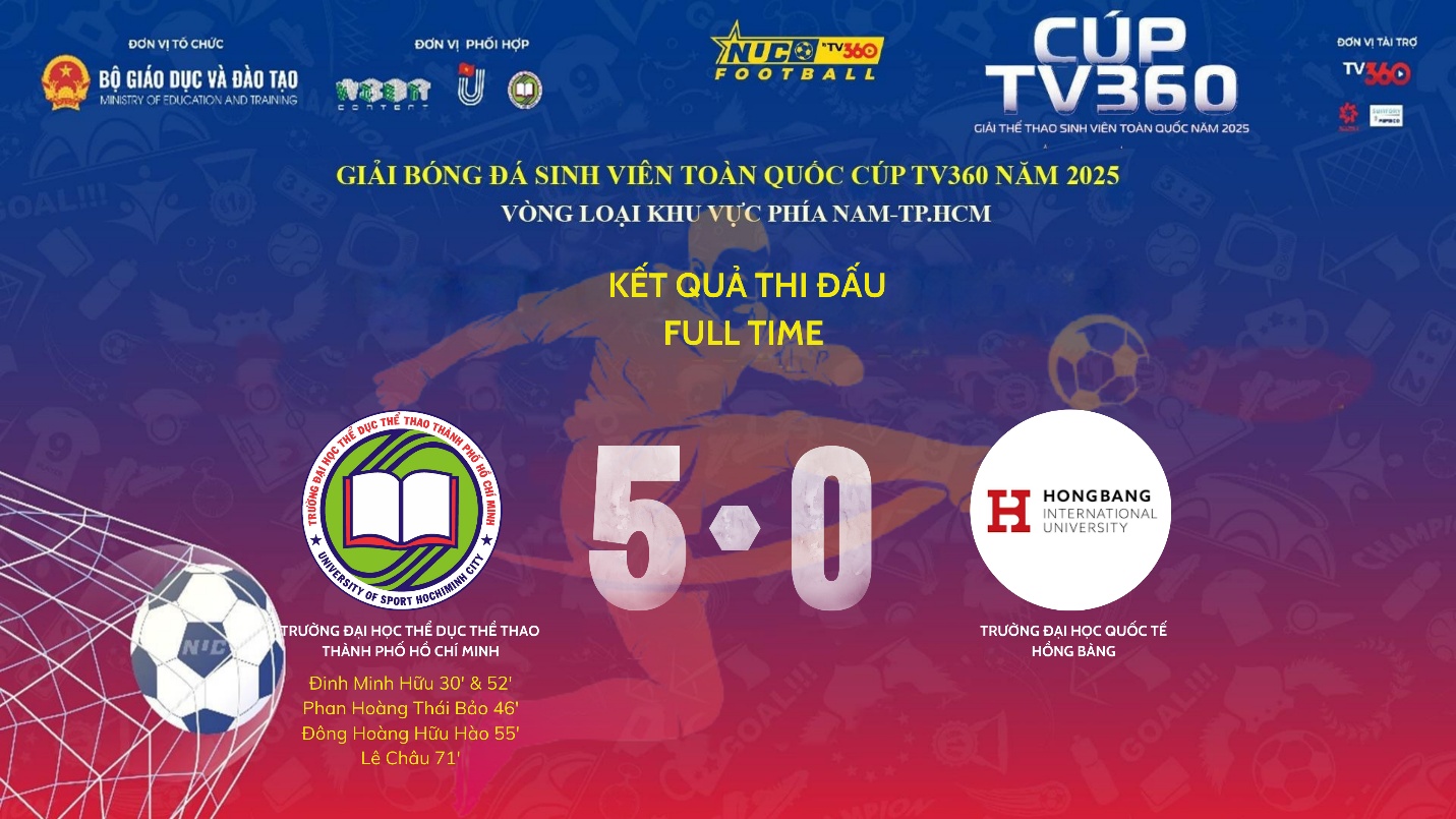 Sáng ngày 15/10/2025, ngay sau lễ khai mạc Giải bóng đá nam sinh viên toàn quốc – Cúp TV360 năm 2025 tại sân vận động Trường Đại học Thể dục Thể thao TP. Hồ Chí Minh (USH), đội tuyển bóng đá nam sinh viên USH đã có màn ra quân đầy ấn tượng khi giành chiến thắng áp đảo 5-0 trước Đại học Quốc tế Hồng Bàng, qua đó khẳng định sức mạnh và bản lĩnh của đội chủ nhà.