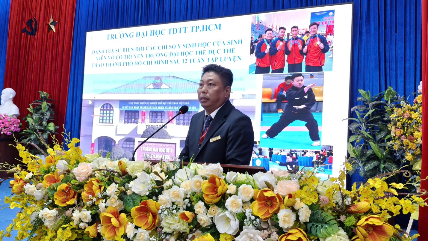 TS. Lý Đại Nghĩa – Giám đốc Trung tâm HL&TĐ TDTT TP. HCM báo cáo tham luận “Nghiên cứu giá trị truyền thống của Liên đoàn Võ thuật Quốc tế TP. HCM năm 2025”