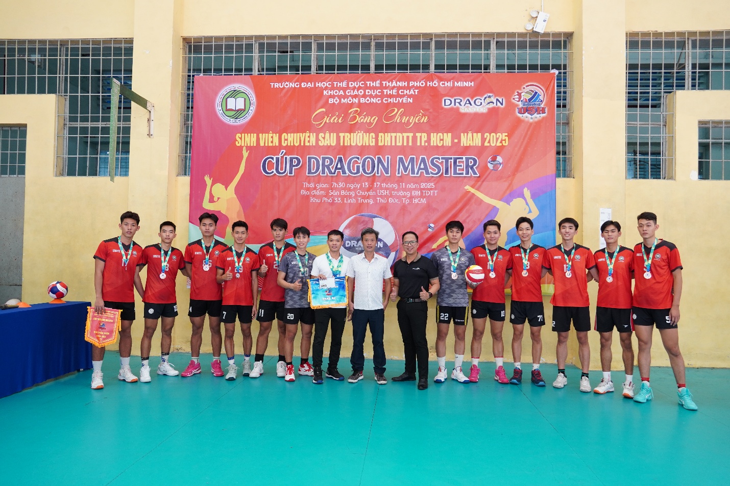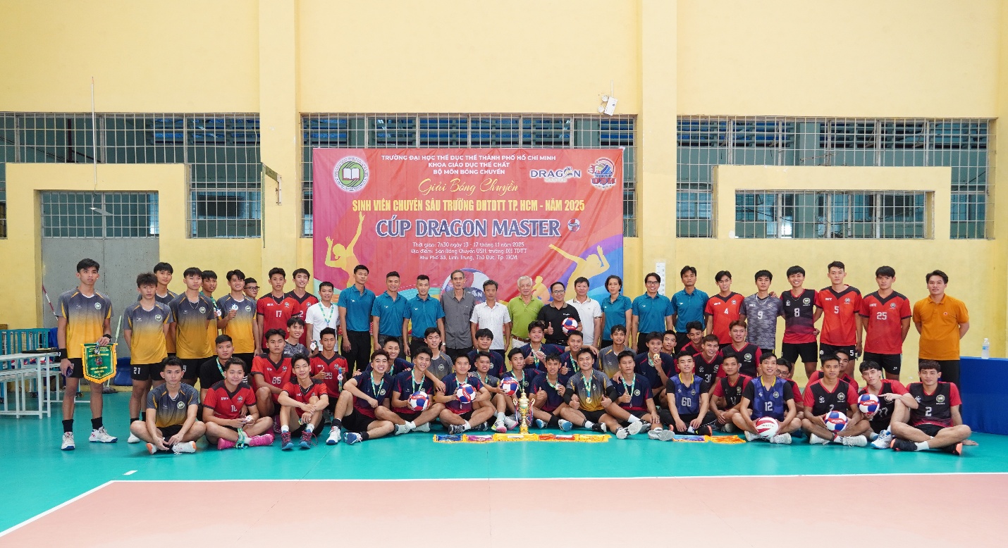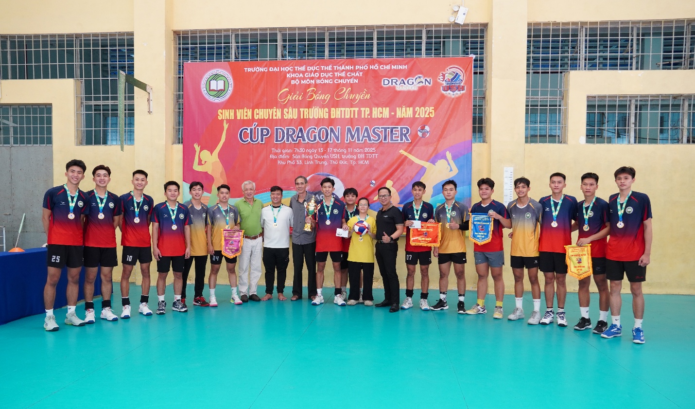 Ngày 18/11/2025, Giải Bóng chuyền Sinh viên Chuyên sâu năm 2025 tranh Cúp DRAGON MASTER đã chính thức khép lại bằng Lễ Bế mạc và Trao giải đầy cảm xúc tại Nhà thi đấu Bóng chuyền Trường Đại học TDTT TP. HCM. Sau 6 ngày tranh tài sôi nổi và hấp dẫn, giải đấu không chỉ tìm ra những nhà vô địch xứng đáng mà còn thắp lên tinh thần thể thao và đoàn kết mạnh mẽ trong sinh viên.