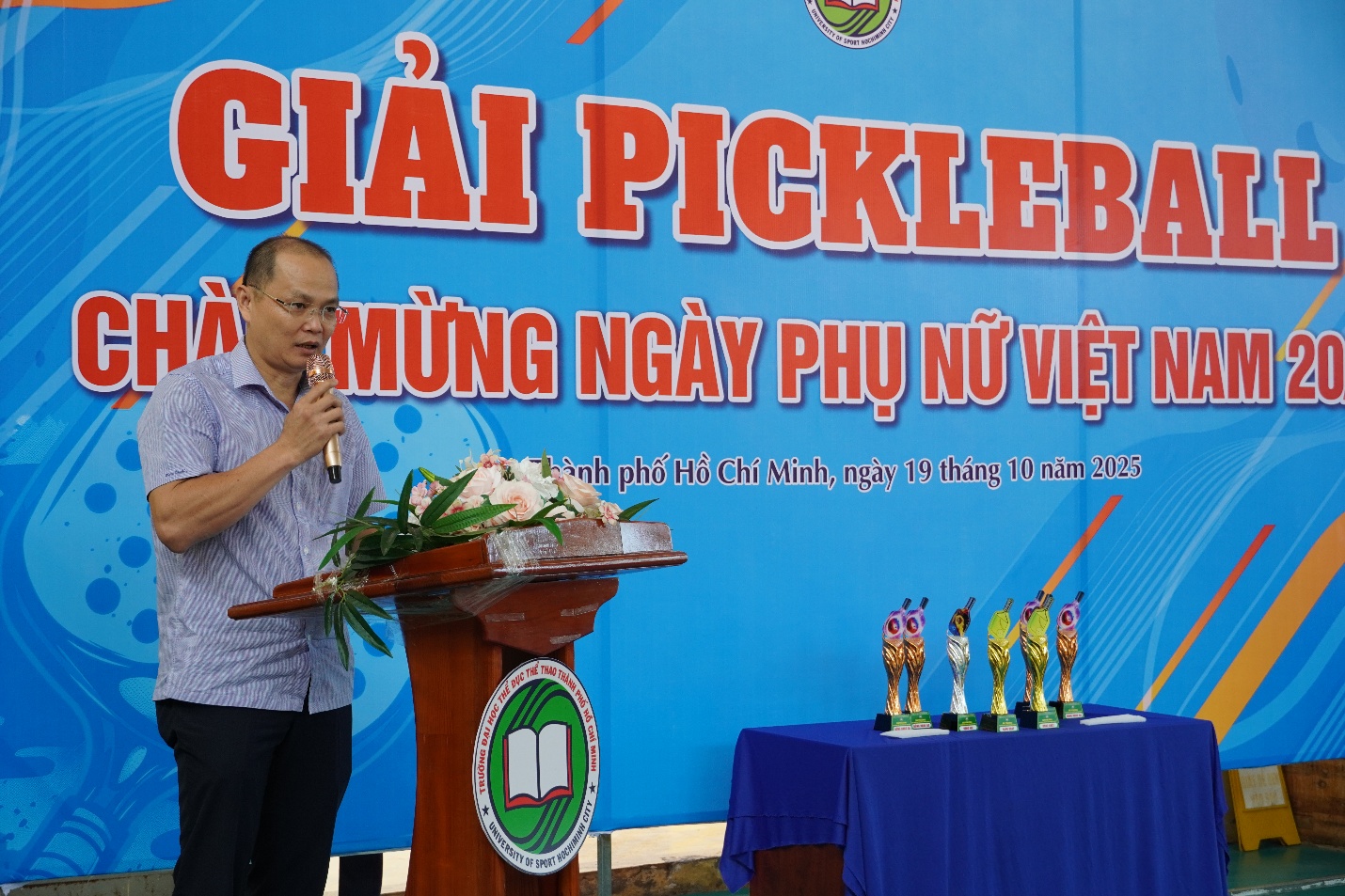 Phát biểu tại lễ khai mạc, TS. Tạ Hoàng Thiện – P. Chủ tịch Công đoàn trường nhấn mạnh:“Mỗi dịp 20/10 là một cơ hội để chúng ta cùng nhìn lại, trân trọng và tôn vinh những cống hiến thầm lặng nhưng vô cùng to lớn của các nữ cán bộ, giảng viên, nhân viên trong Nhà trường. Thông qua hoạt động thể thao như giải Pickleball hôm nay, tôi mong rằng chị em sẽ có thêm niềm vui, thêm động lực để tiếp tục khẳng định bản lĩnh, trí tuệ và sức sáng tạo của phụ nữ Trường Đại học TDTT TP. Hồ Chí Minh.”