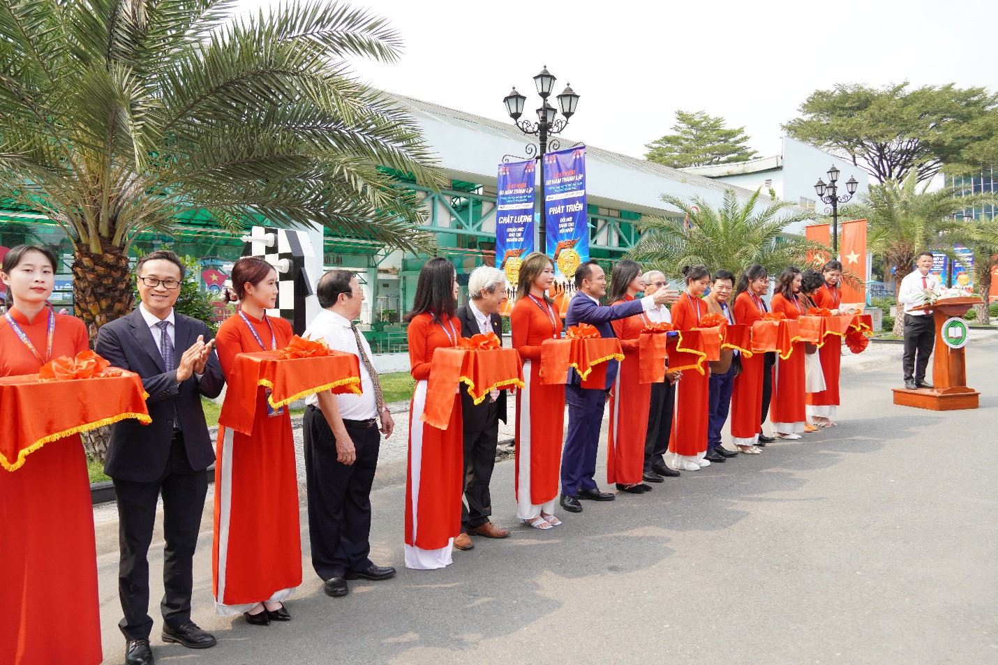 Nghi thức cắt băng khánh thành được thực hiện trang trọng với sự hiện diện của Khách mời, Ban Giám hiệu Nhà trường