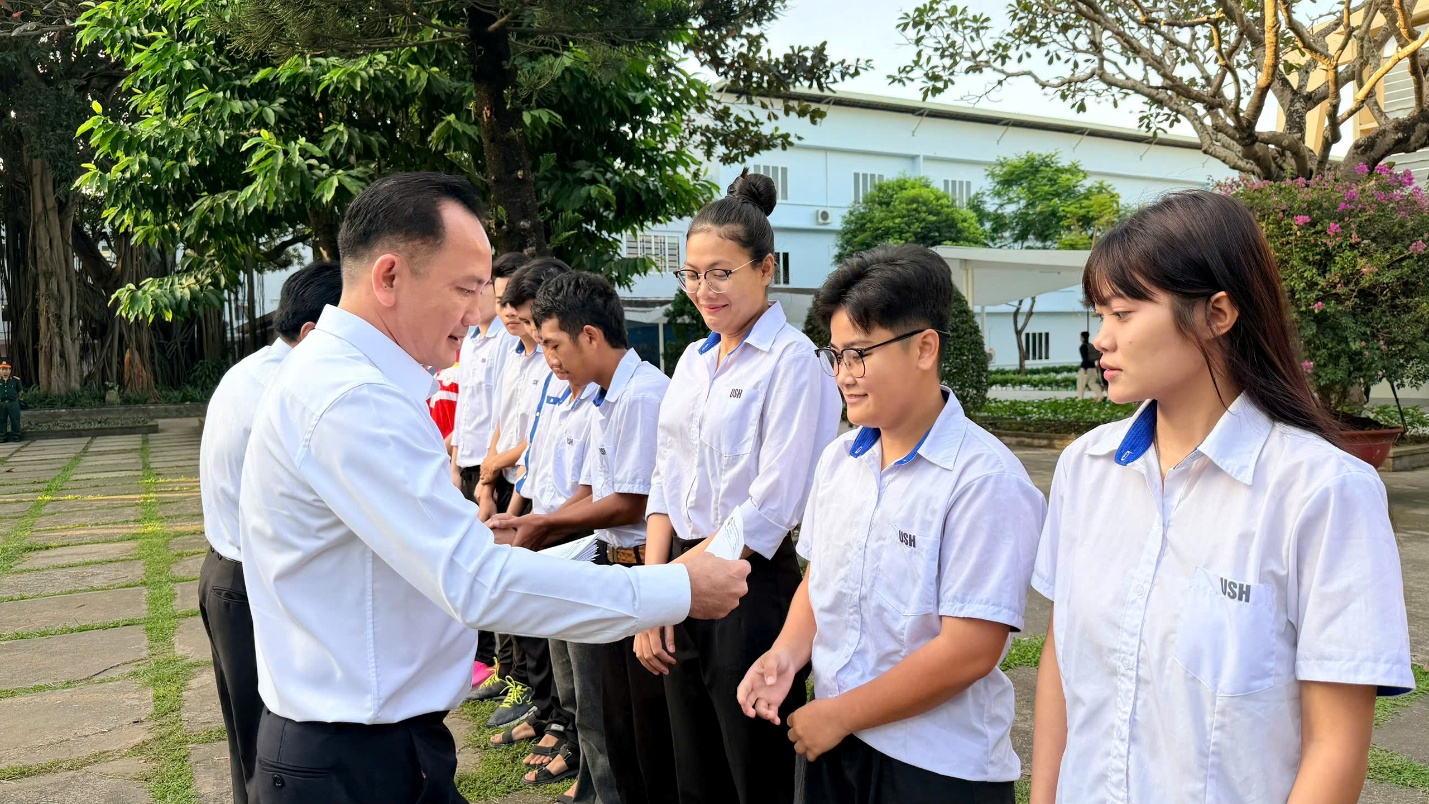 Thấu hiểu điều đó, Ban Giám hiệu Nhà trường đã chuẩn bị những phần quà nghĩa tình, thể hiện sự sẻ chia, đồng hành cùng sinh viên vượt qua khó khăn. Tại buổi lễ, TS. Võ Quốc Thắng – Hiệu trưởng Nhà trường đã trực tiếp trao những phần quà hỗ trợ, đồng thời gửi gắm thông điệp đầy cảm xúc: “Nhà trường luôn theo sát và đồng hành với từng sinh viên, đặc biệt là trong những thời điểm khó khăn nhất. Chúng tôi mong các em luôn giữ vững tinh thần, tiếp tục phấn đấu trong học tập và tin rằng nghị lực sẽ là sức mạnh giúp các em vượt qua mọi thử thách.” Lời động viên chân thành từ Lãnh đạo Nhà trường không chỉ mang ý nghĩa vật chất mà còn là nguồn động lực tinh thần to lớn để các em tiếp tục cố gắng, trưởng thành hơn.
