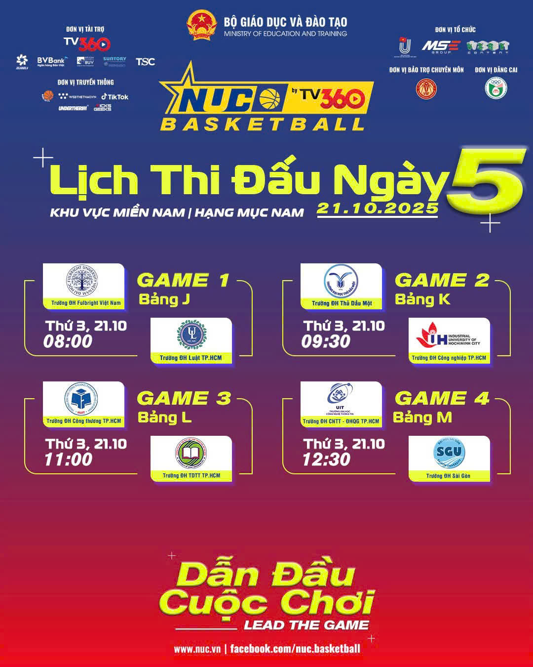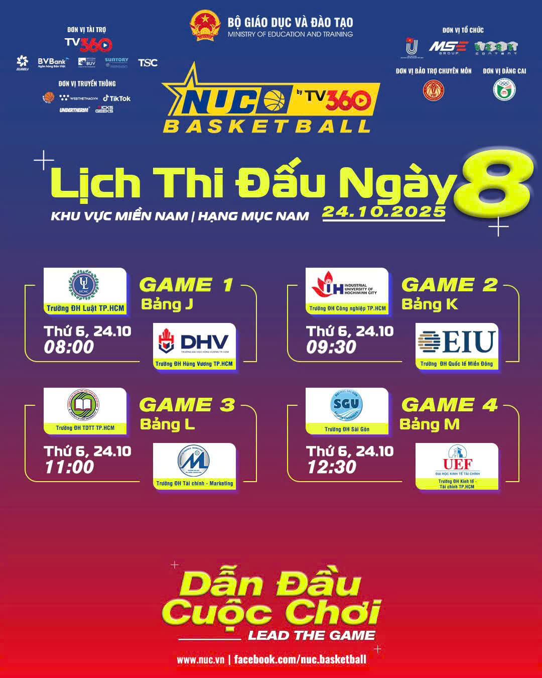 Giải Bóng rổ Sinh viên Toàn quốc – Cúp TV360 năm 2025 do Bộ Giáo dục và Đào tạo, Công ty Cổ phần Giải trí Thể thao Max Sports (MSE) và Công ty Vietcontent phối hợp tổ chức, quy tụ hơn 100 đội bóng nam – nữ đến từ các trường đại học, học viện, cao đẳng trên khắp cả nước. Với khẩu hiệu “Lead The Game – Dẫn đầu cuộc chơi”, giải đấu là sân chơi đỉnh cao, nơi những tài năng trẻ thể hiện bản lĩnh và tinh thần thể thao sinh viên Việt Nam. Tại khu vực miền Nam, vòng loại diễn ra từ 17 – 29/10/2025 tại Nhà thi đấu Trường Đại học Sư phạm Thể dục Thể thao TP.HCM, quy tụ 51 đội bóng đến từ các trường đại học, cao đẳng. Các đội được chia thành 17 bảng đấu, mỗi bảng gồm 3 đội, thi đấu vòng tròn tính điểm để chọn ra đội nhất bảng bước vào vòng knock-out – biến mỗi trận đấu thành một “trận chung kết” thực thụ.
