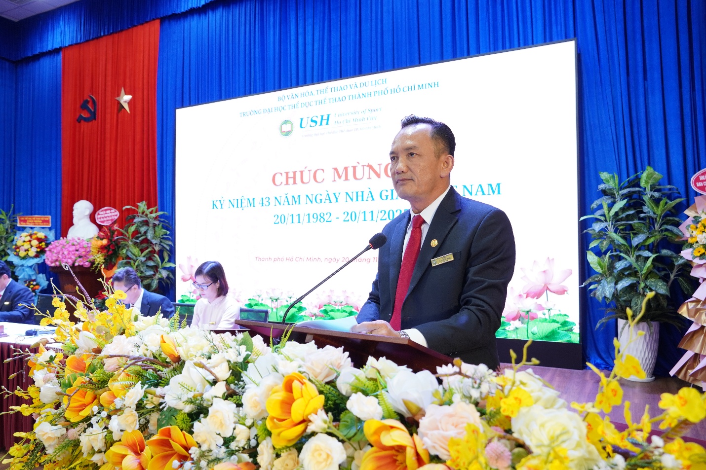 Trong diễn văn trang trọng tại buổi lễ, TS. Võ Quốc Thắng – Hiệu trưởng Nhà trường gửi lời chúc mừng nồng ấm đến toàn thể thầy cô, viên chức và người lao động. Thầy khẳng định Ngày Nhà giáo Việt Nam luôn là dịp để tri ân những đóng góp bền bỉ, thầm lặng nhưng đầy ý nghĩa của đội ngũ nhà giáo – những người “giữ lửa”, truyền cảm hứng và kiến tạo tương lai. Hiệu trưởng nhấn mạnh:“Truyền thống ‘Tôn sư trọng đạo’ đã trở thành mạch nguồn nuôi dưỡng tâm hồn dân tộc Việt Nam. Đối với chúng ta – những người giảng dạy và phục vụ trong sự nghiệp giáo dục – đó chính là niềm kiêu hãnh về một sứ mệnh đặc biệt: đào tạo những con người khỏe mạnh, bản lĩnh, kỷ luật, trung thực và tràn đầy khát vọng vươn lên.” Ông bày tỏ niềm tự hào khi đội ngũ giảng viên và viên chức Nhà trường đã đồng hành suốt gần 50 năm hình thành và phát triển của Trường, không ngừng nỗ lực đổi mới, nâng cao chất lượng đào tạo và nghiên cứu khoa học, đóng góp vào sự phát triển chung của ngành Thể dục thể thao Việt Nam. Hiệu trưởng TS. Võ Quốc Thắng cũng gửi gắm kỳ vọng: “Tương lai của Nhà trường nằm trong chính đôi tay và trái tim nóng của chúng ta. Năm học 2025 – 2026 sẽ là năm của hành động, của sự bứt phá và tinh thần dám tiên phong. Hãy để mỗi giờ giảng là một giờ truyền cảm hứng, mỗi ngày làm việc là một ngày cống hiến.”