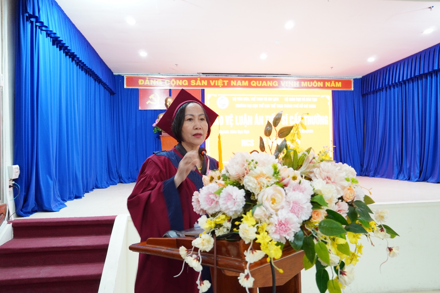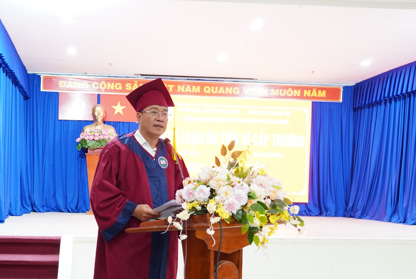 Hội đồng đánh giá Luận án Tiến sĩ được thành lập theo Quyết định số 346/QĐ-TDTTHCM ngày 26 tháng 9 năm 2025 của Hiệu trưởng Trường Đại học Thể dục Thể thao Thành phố Hồ Chí Minh gồm: PGS. TS Đặng Hà Việt – Chủ tịch Hội đồng; TS. Nguyễn Thanh Bình – Phản biện 1; PGS. TS Lương Thị Ánh Ngọc – Phản biện 2; PGS. TS Nguyễn Đức Thành – Phản biện 3; PGS. TS Nguyễn Văn Hòa - Ủy viên; TS. Tạ Hoàng Thiện - Ủy viên và PGS. TS Lê Thị Mỹ Hạnh - Ủy viên thư ký.