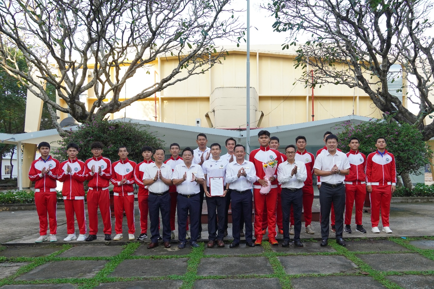 Ban Giám hiệu nhà trường, lãnh đạo khoa GDTC cùng HLV và VĐV đội tuyển Bóng rổ USH Dâng hoa tại lễ xuất quân